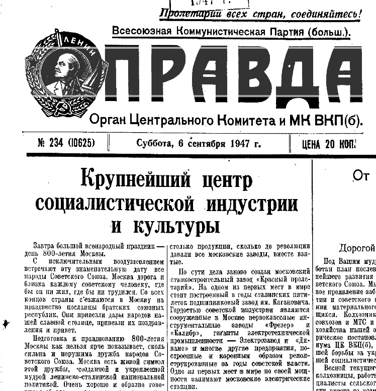 Công tác chuẩn bị cho lễ kỷ niệm 800 năm thành lập Moskva thể hiện rõ nét sức mạnh và tình hữu nghị bền chặt giữa các dân tộc Liên Xô. Moskva là biểu tượng sống động của tình cảm được tạo dựng và củng cố bởi những đường lối sáng suốt của Lenin và Stalin. Điều này được thể hiện một cách đẹp đẽ và giàu hình ảnh trong một bài thơ của các nhà thơ Gruzia mà phái đoàn nước này đã mang đến Moskva cùng với những món quà khác dành tặng cho công nhân thủ đô: