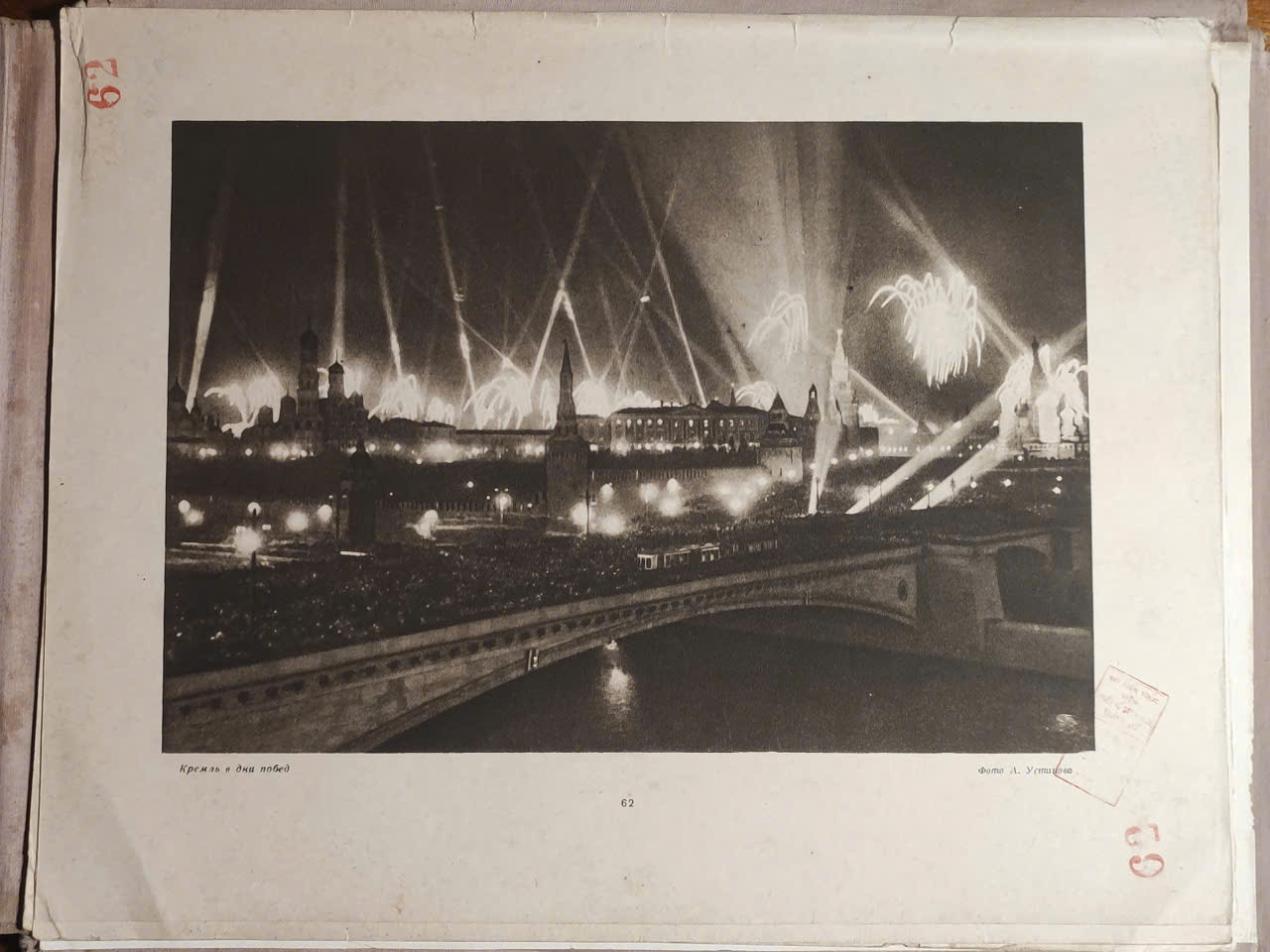 Những bức ảnh trên được chụp lại bởi В. Ковригина, Н. Грановского, Г. Лебедева, А. Устинова và А. Тартаковского. So với hiện nay có lẽ trong số các bạn có thể chụp đẹp được hơn những tay này, tuy nhiên giai đoạn này là sau chiến tranh, cùng với hạn chế công nghệ và tái thiết sau chiến tranh. Việc Kremlin vẫn được giữ nguyên vẹn là nỗ lực của toàn Liên Xô, những công dân tiến bộ trên toàn thế giới chống lại sự bành trướng của Phát xít, không cho chúng được diễu binh trên Quảng trường Đỏ.